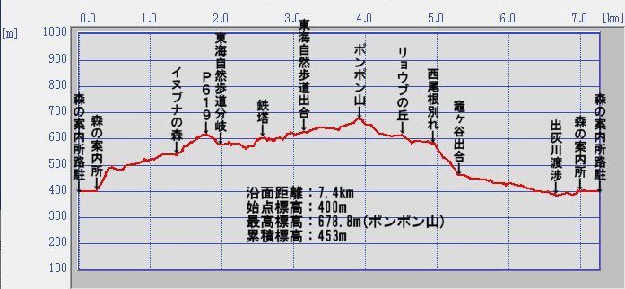 高槻10:10(府道6、府道733)=森の案内所路駐10:55→森の案内所11:00→11:47イヌブナの森11:57→東海自然歩道分岐12:19→12:36鉄塔(昼食)12:57→東海自然歩道出合13:14→13:34(678.8m)ポンポン山13:48→リョウブの丘13:59→西尾根別れ14:06→14:20竈ヶ谷出合14:25→出灰川渡渉15:00→森の案内所15:08→森の案内所路駐15:16(府道733、府道6)=高槻15:58