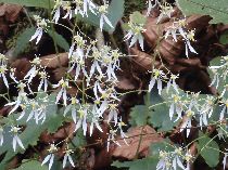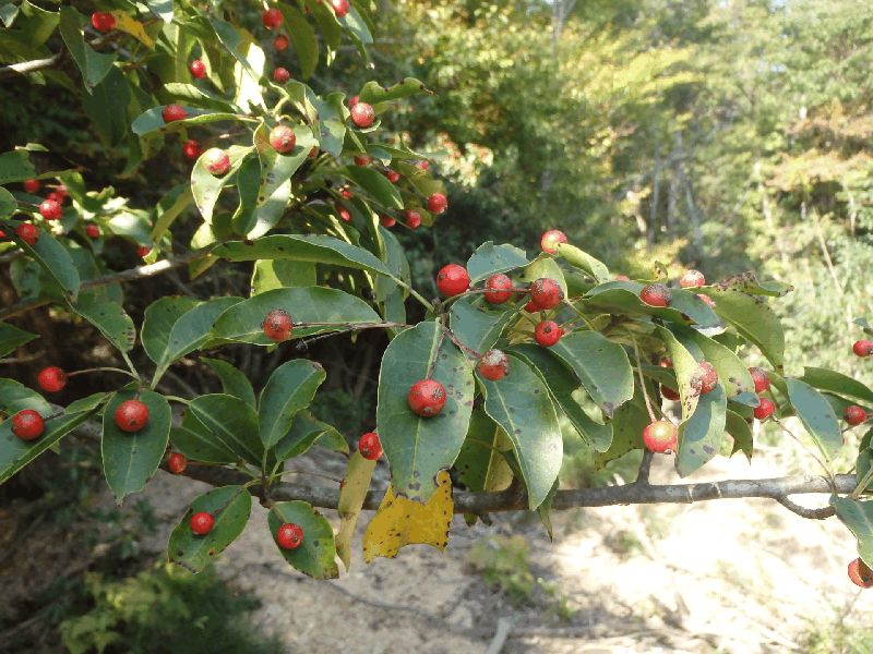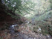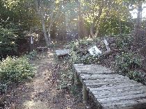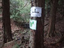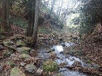 陽光の降りそそぐポカポカ陽気の山頂からは、遠方は白濁し京都や大阪方向は霞の彼方だ。また、木々が成長してかつて望めた愛宕山も見えずがっかりだ。山頂から西尾根に入り、出灰を左に分け直進だ。気持ちの良い疎林帯のリョウブの丘を右に見て直進すると、色づき始めた広葉樹がまばらに立ち並ぶ竈ヶ谷分岐だ。トラロープに沿って徐々に勾配の増す下り坂を下り、フクジュソウ保護地横のテントを過ぎて樹林帯を下ると竈ヶ谷出合だ。急坂下りでガタついた足腰をなだめてから渡渉開始だ。ここから渡渉を繰り返しながら下る約1.5kmの竈ヶ谷沿いの花街道だが今は端境期だ。点在する保護柵にはオタカラコウやヨシノアザミだけが咲き残っていた。針葉樹林帯に入ってしばらく進むと出灰川出合だ。いつもは渡渉に少し難渋すのだが、流れにコンクリの足場が新設され、出水時でなければ容易に渡ることができる。出灰川に沿って東へ進むと森の案内所だ。