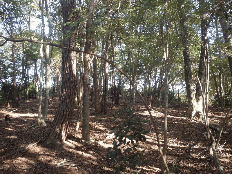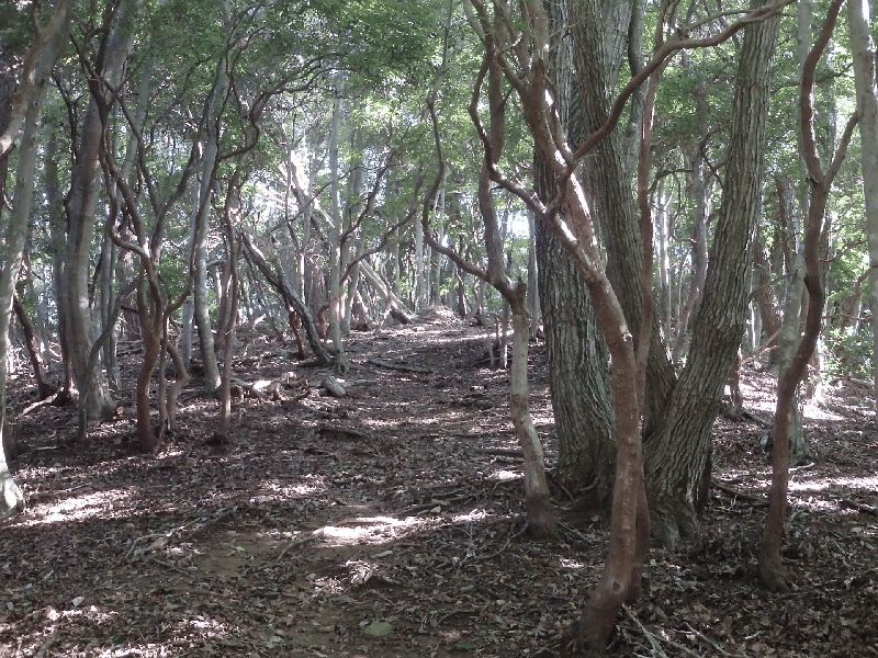鎖ゲート横から構内へ進み、工事らしい数台の軽四が止まっている森の案内所の建物の傍から東尾根の急坂に取り付く。すぐ息が切れるのでしばしば息継ぎ休憩をしながら標高差100mの杉林の尾根を登るとベンチのある東尾根端だ。すぐ先の野山の丘広場で小塩山の山塊を眺めながら息を整え、コナラなどの広葉樹の尾根道を進む。アップダウンしながら上り坂の小ピークからは西に鴻応山や湯谷ヶ岳など北摂の山々が西尾根越しに連なっている。やがて赤松のそびえ立つ雑木林尾根が続き、一株だけ目についた清楚なセンブリの花を愛でたりしてゆっくり歩を進める。竈ヶ谷分岐標識の地点がイヌブナの森広場だ。冬場は明るいが、ウリカエデ、コナラ、イヌブナなどが周りに鬱蒼と茂っているベンチで小休止だ。ベンチからアセビやウバメガシ?の樹林帯を登ると鉄塔だ。かつては外畑の変電所が見渡せたが、周りの木々が成長して展望は殆んど望めない。さらに少し登るとP619の赤い大鉄塔だがここも見晴しは利かず、雑木林の尾根を下ると鞍部が、右が竈ヶ谷、左が東海自然歩道分岐の十字路だ。鞍部を直進して鉄塔を過ぎて次の鞍部から少し上り坂をあがると右手にプラ階段がある。プラ階段を上り、広い小ピークの赤色大鉄塔の下で昼食だ。ここは登山道から離れた静かな別天地、緑を愛でながら今秋初めての熱いカップラーメンとコーヒーは格別だ。元へ戻って東尾根をしばらく南下すると東海自然歩道に合流、倒木も片づいた尾根道を西へ辿るとポンポン山三角点広場だ。