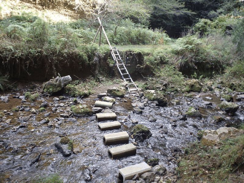 (出灰川に新設された飛び石) (渡渉地点の道標) (森の案内所へ)