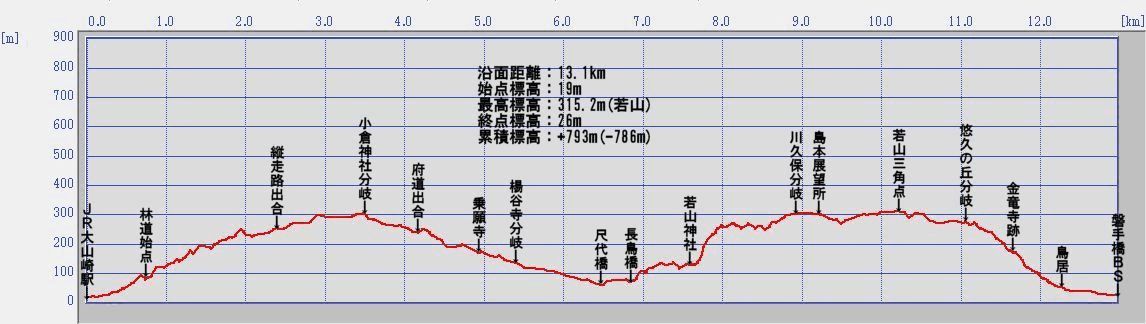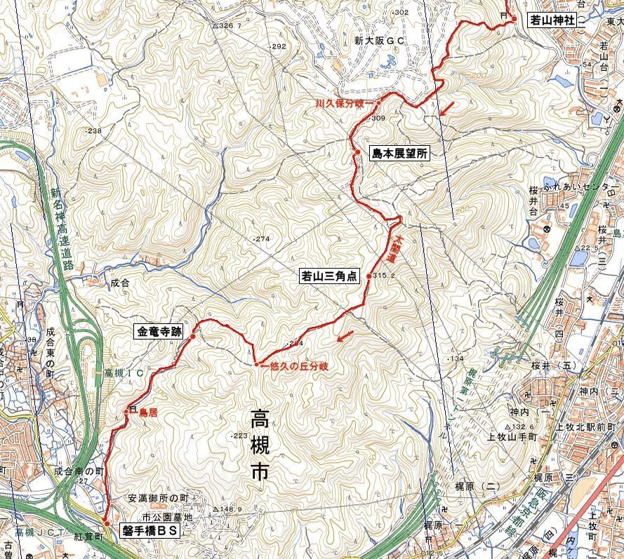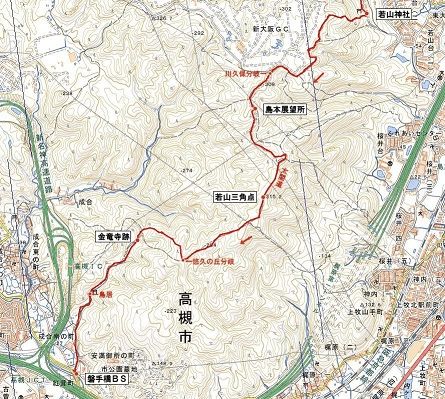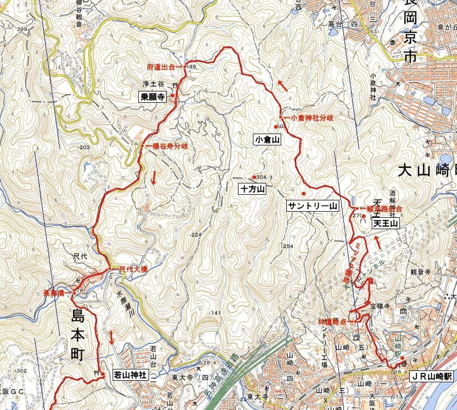JR山崎駅10:34→林道入口10:52→天王山登山道出合11:31→11:52小倉神社分岐12:01→府道出合12:22→乗願寺12:27→楊谷寺分岐12:35→尺代橋12:53→長鳥橋12:59→13:14若山神社13:22→川久保分岐14:11→島本展望所14:19→(315.2m)若山三角点14:37→悠久の丘分岐14:49→金竜寺跡15:04→鳥居15:20→磐手橋BS15:30