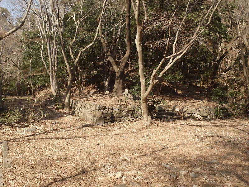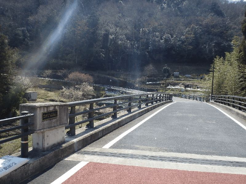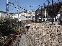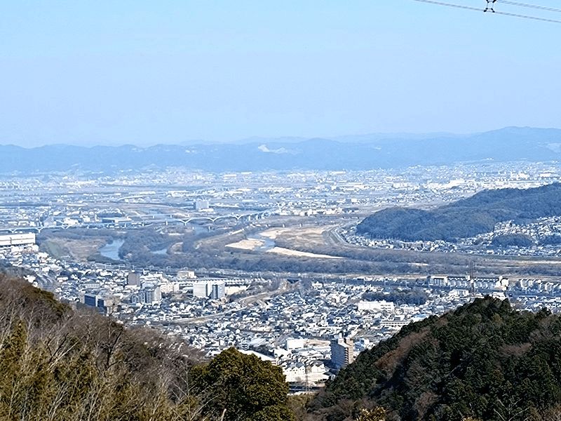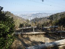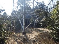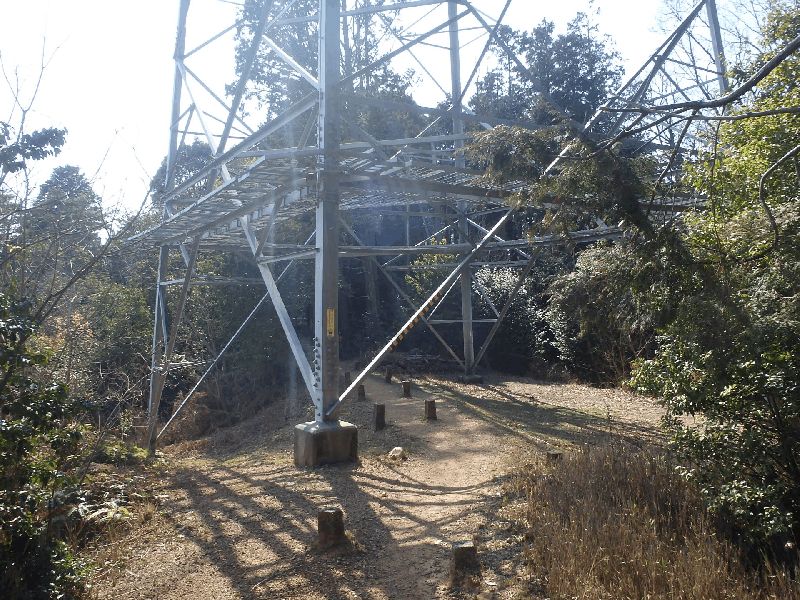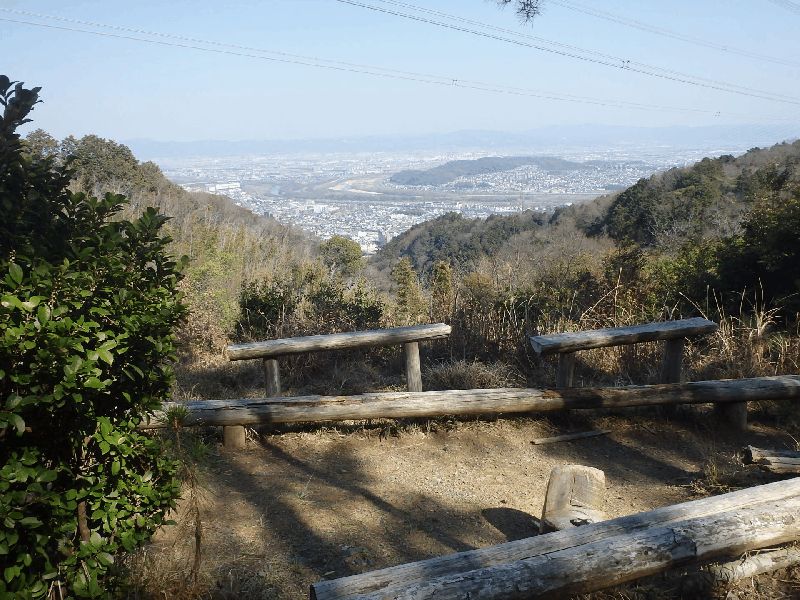 若山神社にここまで無事歩けたことを感謝し、久しぶりの太閤道へ出発だ。ツブラジイの巨樹の間をぬうように九十九折の丸太階段が続く。ここまでで体力を消耗しているのでこの標高差150mばかりの急坂は息もたえだえだ。尾根上に達すると、ゴルフ場の縁をなぞるように小さなアップダウンを繰り返しながら進むと川久保分岐の四ッ辻だ。直進の川久保を正面に見て左折し、少し進むと東方の展望が開けた島本展望所だ。天王山と男山の間で桂川、宇治川、木津川の三川がうねる光景は壮観だ。道端の若山三角点を通り、高圧線銀座らしく何度か鉄塔下を通る。公園墓地にくだる悠久の丘分岐を右折して金竜寺跡へ向かう。しばらく尾根端を下ると谷間に平地が広がる金竜寺跡だ。付近に石塔や石碑があり、平地に石垣が残るだけだ。参道と思しき谷沿いの道をしばらく下ると磐手橋だ。付近は高槻インターチェンジの工事のため大きく変わっている。