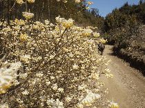 山崎駅舎を出てコンビニ前から細道を抜けると西国街道の関大明神社前だ。小さな流れに沿って細道をたどり、JR線路トンネルを通り抜け大阪福祉専門学校の表示通りに坂道をひたすら上る。最奥の建物の児童養護施設の小広場がハイキングロード始点だ。雑木林の九十九折の林道をしばらく登り続けると海抜200m地点から道の両側にミツマタが現れ始める。ミツマタは枝先が必ず三股に別れている落葉低木、沈丁花の仲間で爽やかな香りの花だ。天王山頂上は立ち寄らず、天王山登山道に合流して北上だ。小倉神社分岐から楊谷寺方面へヤブツバキの多い尾根道をしばらく下ると府道出合だ。直進の楊谷寺を正面に見て、左折して府道を浄土谷へ向かう。丈六の阿弥陀如来坐像が祀られた乗願寺は西山の大仏とも言われ、門番猫をからかいながら小休止だ。乗願寺から車道を少し下り、京都大阪府境で楊谷寺からの道と合流、しばらく車道をたんたんと下ると尺代橋だ。尺代の集落を抜けて長鳥橋を渡り、山裾のしんどい上り坂の歩道を若山神社へ向かう。